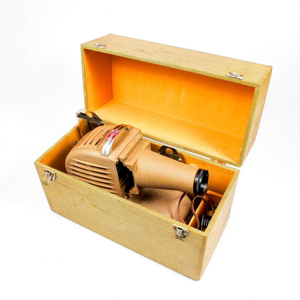 Très beau projecteur vintage en parfait état. Il est vendu complet avec sa boite d’origine et deux passes vues: Un pour des diapositives moyen format 6x6 et un pour des diapositives 24x36.