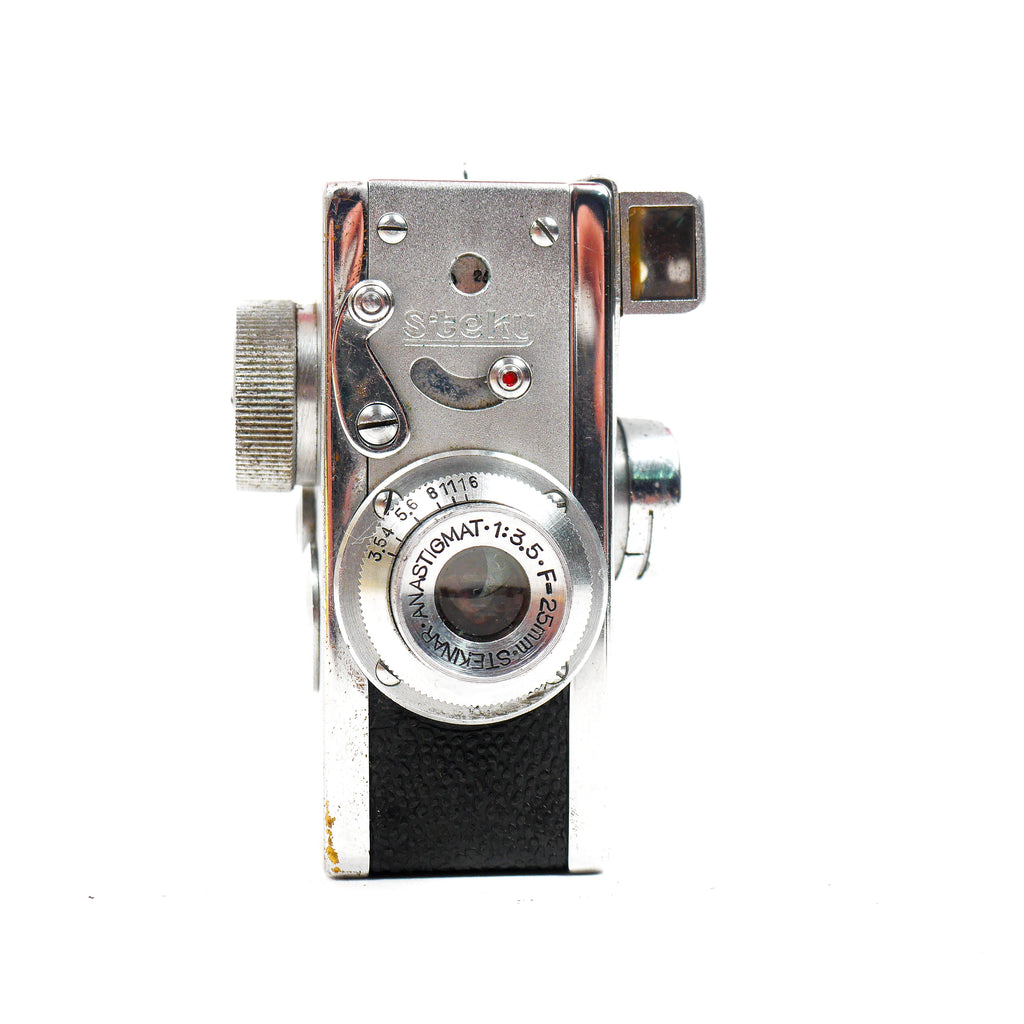 Appareil photo “Espion”. Utilise des film 16mm. En bon état de fonctionnement. Vendu avec son capuchon d’objectif et le filtre jaune d’origine.